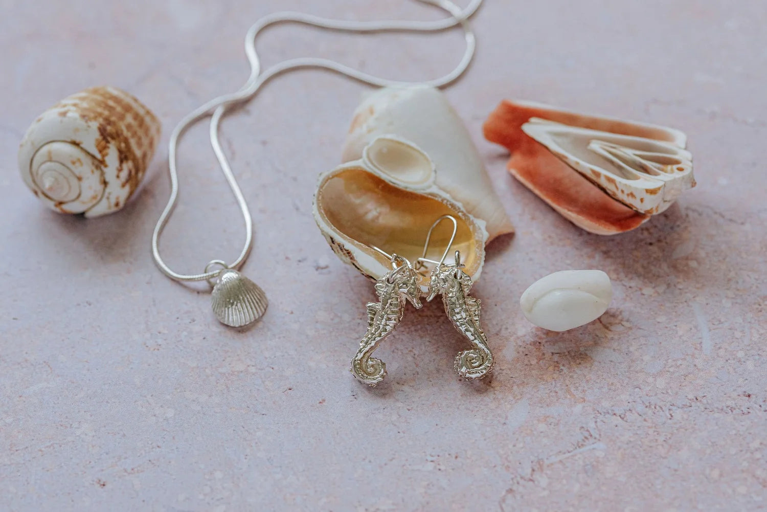 Handcrafted silver seahorse earrings and shell pendant necklace styled with natural seashells, part of a coastal inspired jewellery collection.